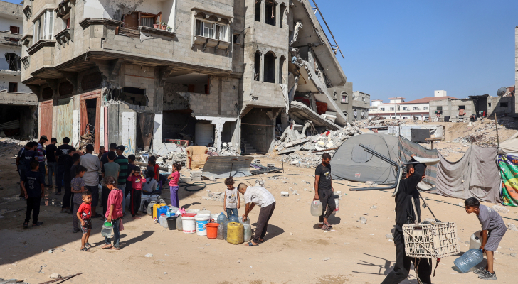 فلسطينيون يجمعون المياه بالقرب من مبنى تم تدميره جنوب قطاع غزة