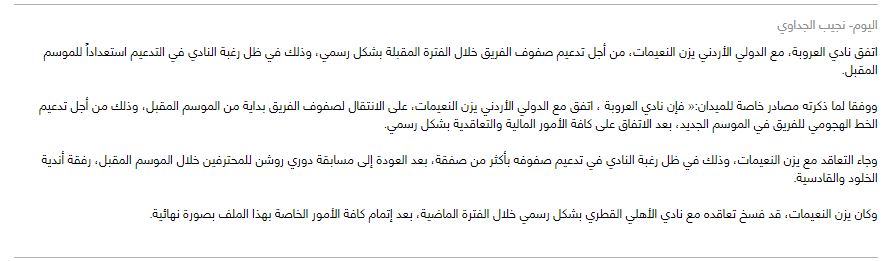 أفادت وسائل إعلام سعودية بأن نادي العروبة حسم صفقة نجم المنتخب الأردني يزن النعيمات، لتدعيم صفوف الفريق خلال الفترة المقبلة بشكل رسمي.
