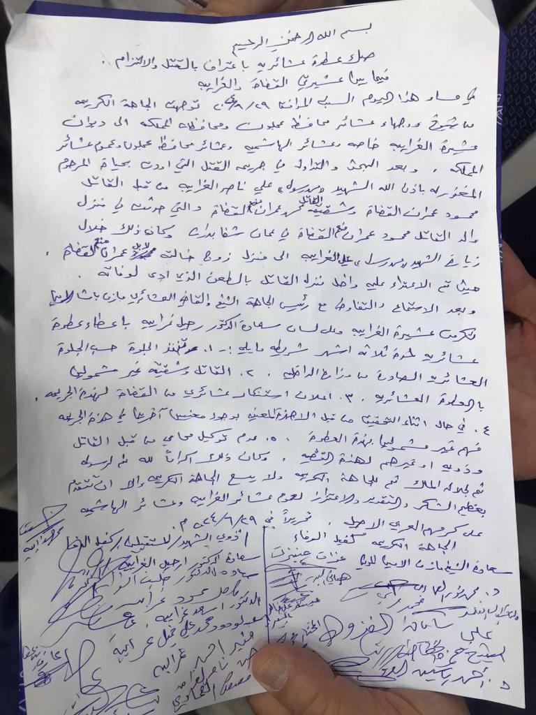 عشيرة الغرايبة تمنح عطوة اعتراف بجريمة شفا بدران - صورة