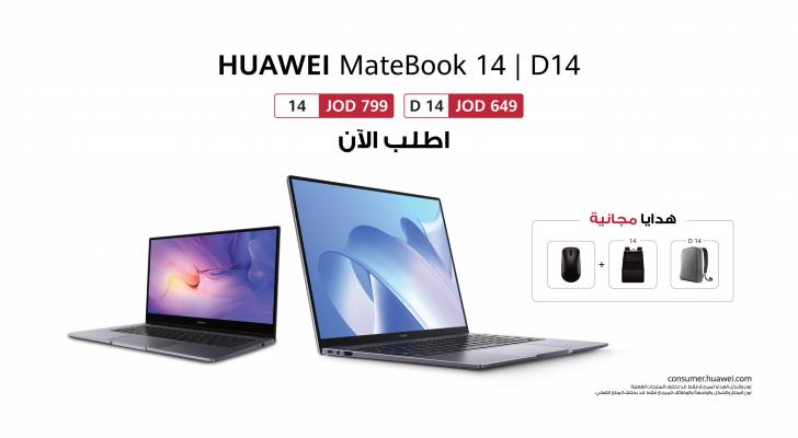 أما HUAWEI MateBook D 14، فيبلغ سعره 649 دينارًا، ويمكنك طلبه من خلال متجر هواوي شروق الأردن الإلكتروني عبر هذا الرابط: https://store.reach-tele.com/ar/laptops/huawei-matebook-d14-i5-10th ، وستحصل على هدايا مجانية تضم: فأرة بلوتوث، وحقيبة ظهر بقيمة 15 دينارًا، وكفالة لمدة 12 شهرًا.