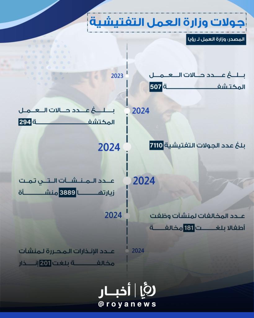 وحول عدد الجولات التفتيشية التي أجرتها الأقسام المتخصصة في وزارة العمل، كشف الناطق باسم الوزارة محمد الزيود أنها بلغت (7110) للعام 2024 زيارة.