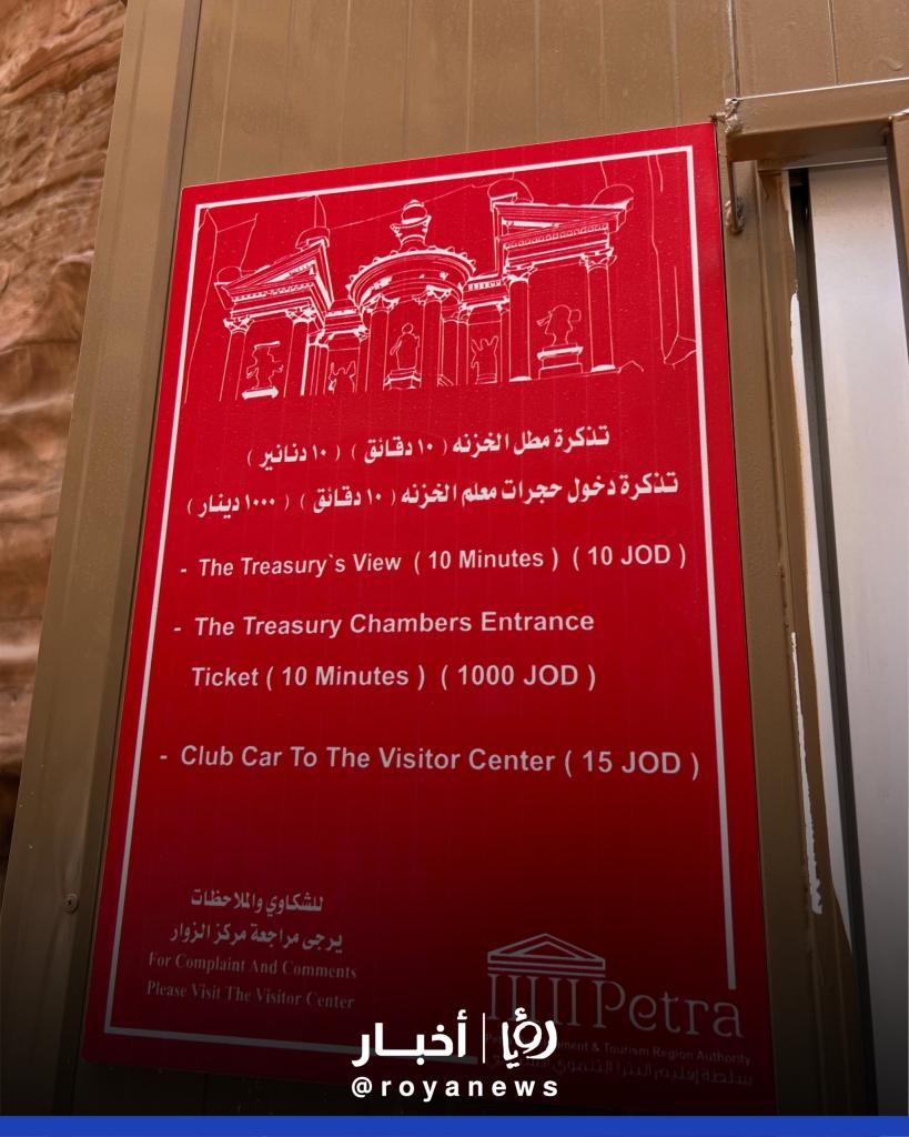 وفي سياق أخر التقطت عدسة "رؤيا" لائحة تظهر اشتراط السائح مبلغ ألف دينار أردني وذلك للدخول إلى معلم الخزنة لمدة 10 دقائق، إضافة إلى دفع 10 دنانير للدخول إلى مطل الخزنة لمدة 10 دقائق.