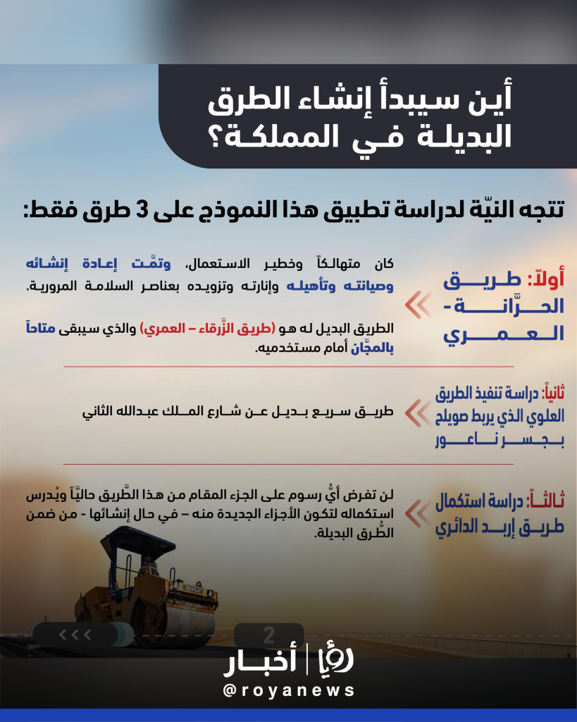 أما الطريق الثاني فهو دراسة إنشاء جسر علوي يربط منطقة صويلح بجسر ناعور بالقرب من مديرية الأمن العام، ليكون بديلاً سريعاً عن شارع الملك عبد الله الثاني في ظل الازدحام الكبير الذي يعاني منه هذا الطريق. والطريق الثالث هو دراسة استكمال طريق إربد الدائري، حيث لن تفرض أي رسوم على الجزء الحالي منه، وسيتم دراسة استكماله ليشمل الأجزاء الجديدة كطرق بديلة.